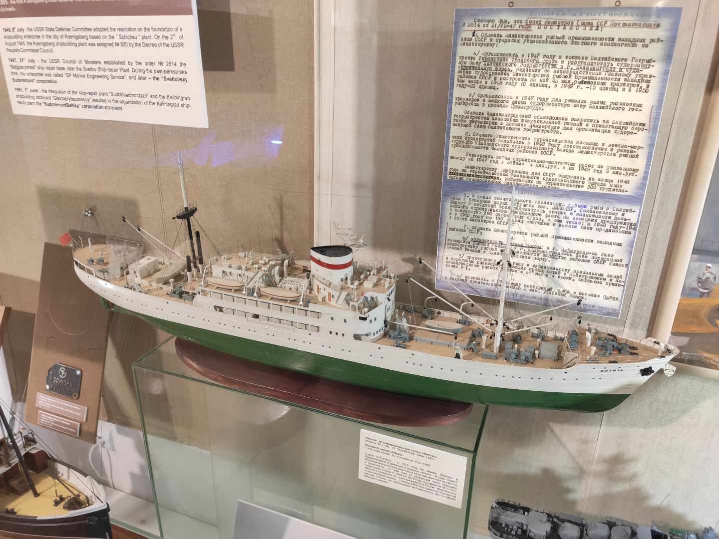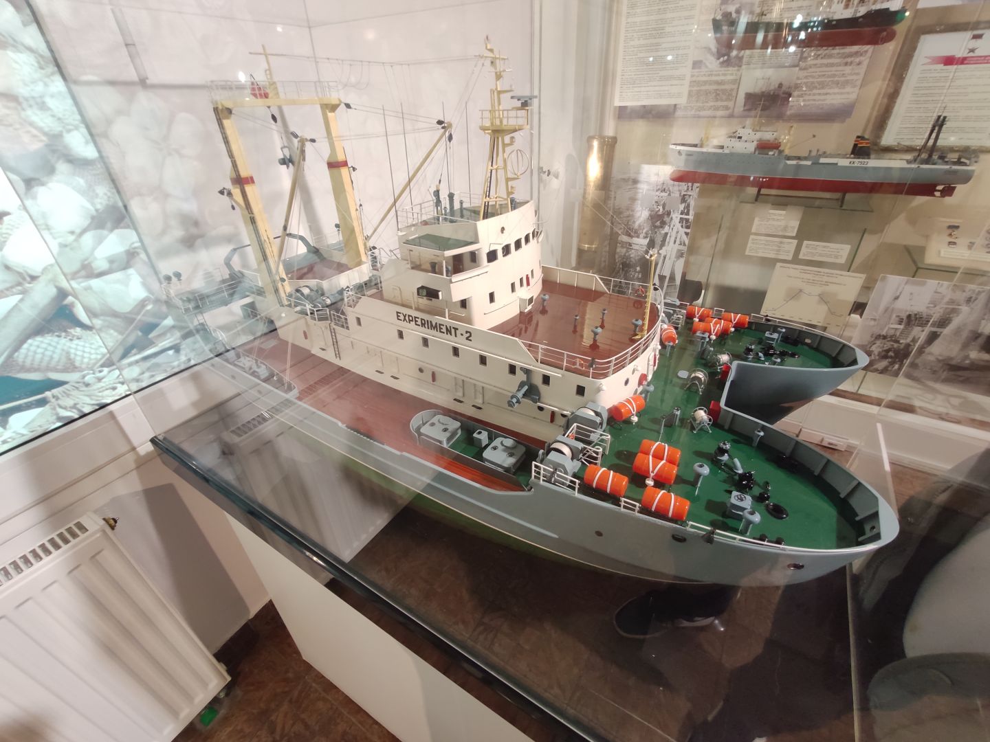Все вокруг остова рассказывает о жизни, которая кипела на таких ботах. Экспозиция «Люди моря» — это собрание подлинных предметов послевоенных десятилетий.