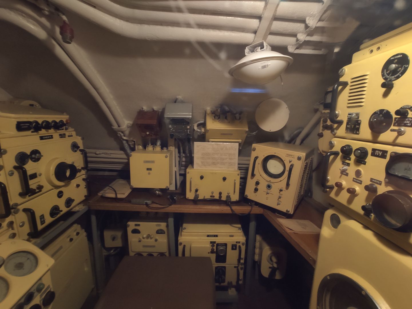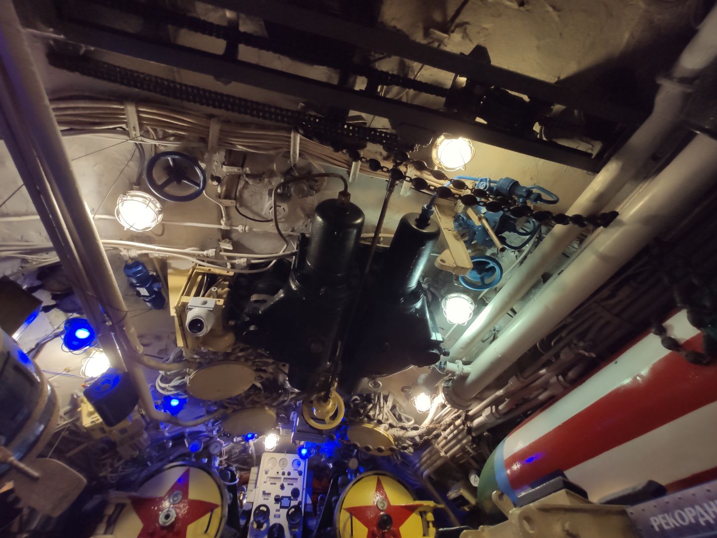 · Центральный пост: мозг субмарины. Это место — нервный узел всего корабля. Два перископа, как глаза лодки. Десятки вентилей, маховиков и кнопок. Штурвал горизонтальных рулей, с помощью которого лодка «ныряла». Здесь все настоящее, рабочее. Кажется, вот-вот прозвучит команда «Погружение!», и экипаж замернет у своих постов. И да, здесь тоже можно стоять прямо, но пространство заполнено оборудованием так, что чувствуешь себя частью сложного механизма.