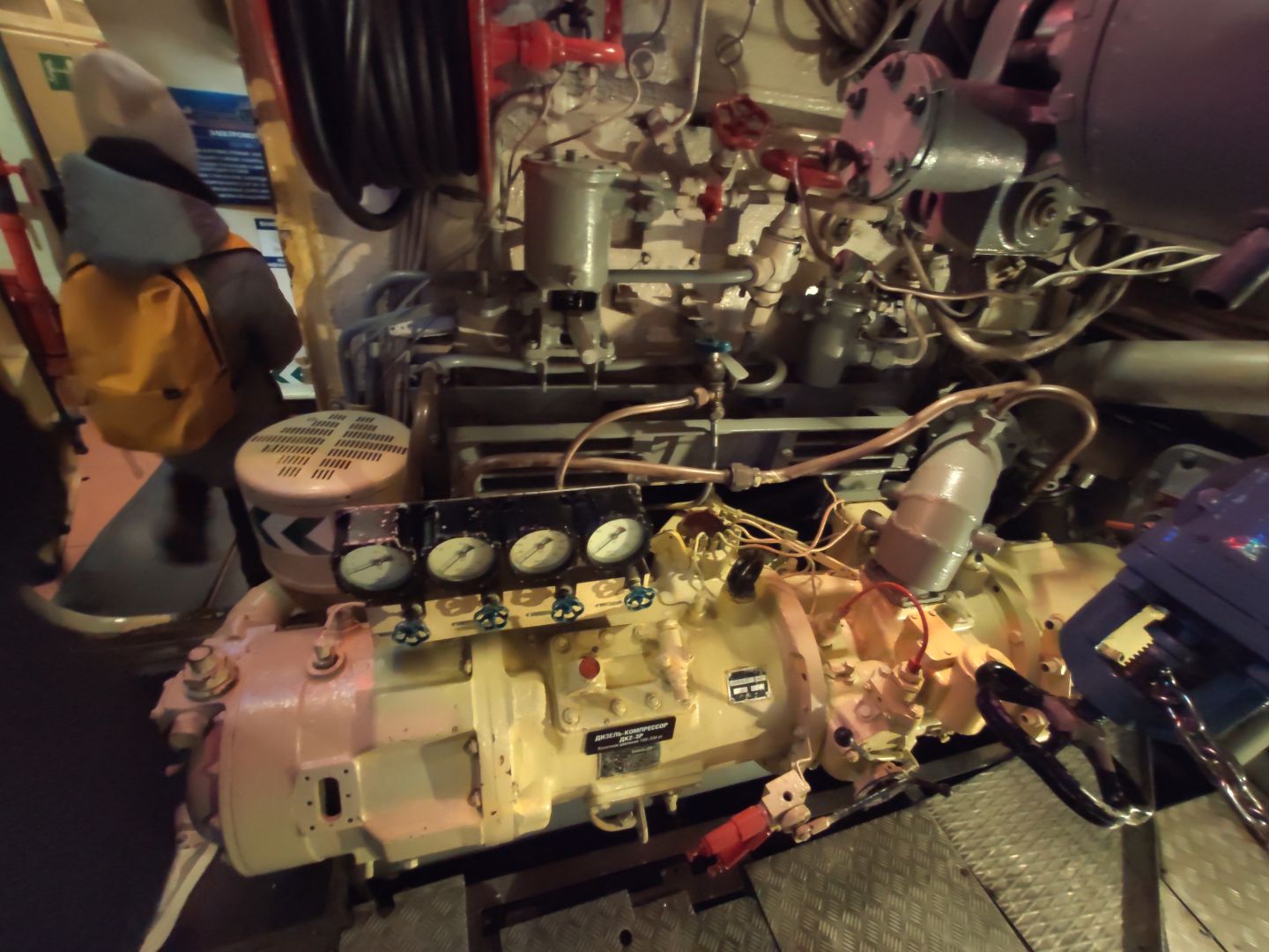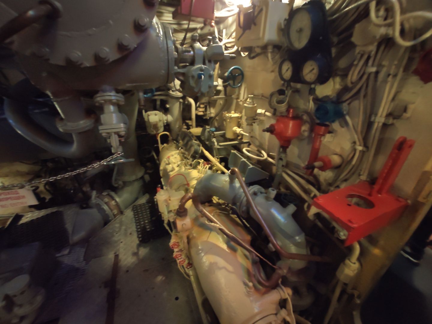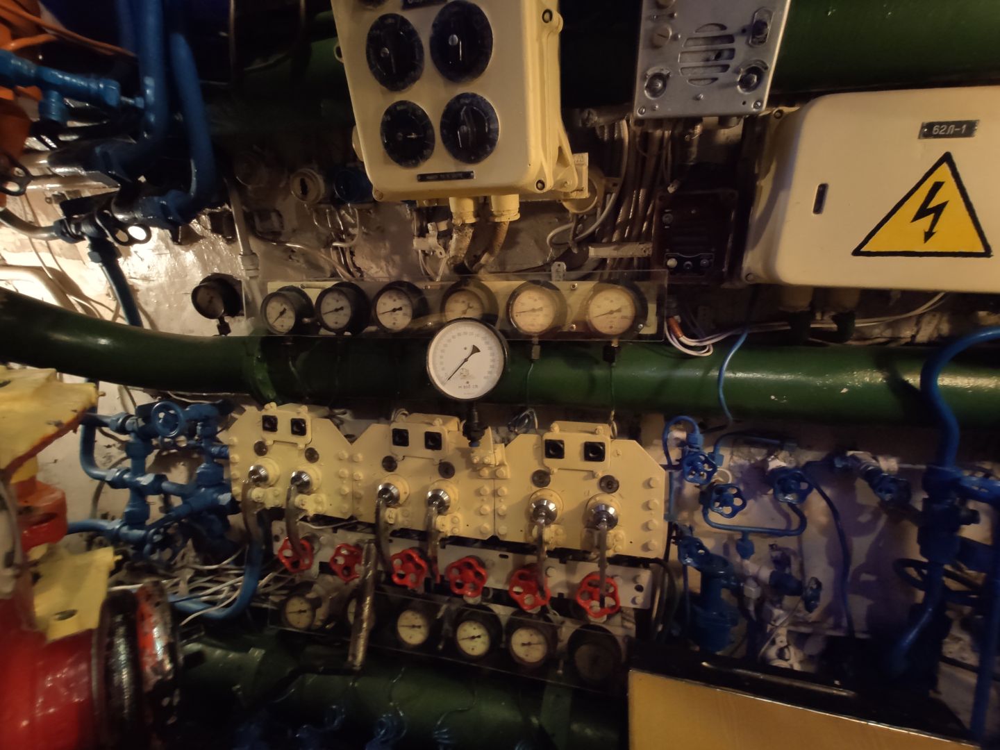 · Дизельный отсек: сердце, которое стучит. Спускаешься сюда — и попадаешь в царство механиков. Два огромных дизеля, которые давали лодке ход и заряжали аккумуляторы. Представьте этот гул в замкнутом пространстве! Рядом — гигантские электромоторы для бесшумного подводного хода. Высота позволяет стоять, но воздух наполнен памятью о машинном масле и напряженной работе.