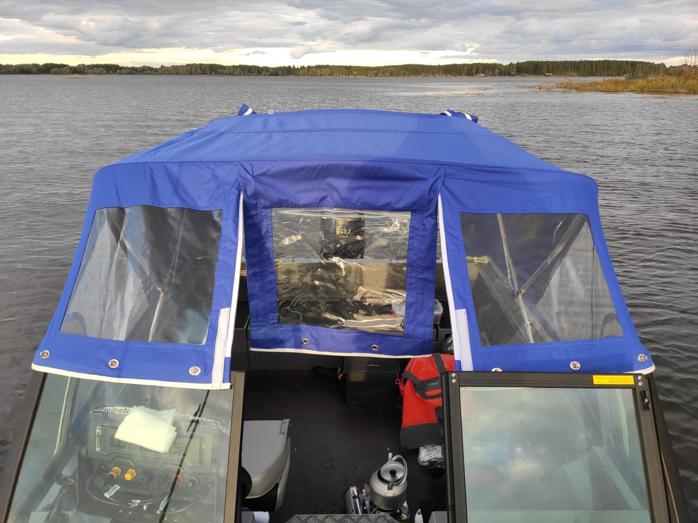 Первое, что поменял — родное стекло. Оно было мягкое, царапалось на раз. Поехал в Кострому, в «Лодку 44». Попросил сделать калёное, нормальное. Они сделали — теперь смотрю сквозь него, а не в сетку царапин. Штатного тента не было вообще, так что заказал сразу у них же. Не в полный рост, но чтобы голова и плечи были под защитой. Получилось аккуратно и по делу.