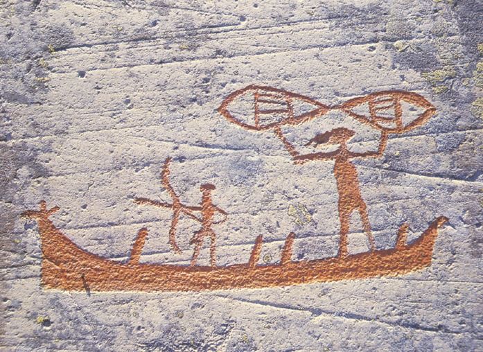Северная Европа: Лодка-китобойня. Петроглифы в Альте (Норвегия) и Немфоране (Швеция) изображают лодки с ярко выраженными загнутыми штевнями. Часто на них изображено множество гребцов, а сами суда показаны в сценах охоты на крупных морских млекопитающих. Это говорит о выходе в открытое море и о сложной социальной организации: управление таким судном требовало координации усилий многих людей. Эти изображения — не бытовые зарисовки, а скорее ритуальные образы-обереги, призванные обеспечить удачу в смертельно опасном предприятии. Лодка здесь — символ коллектива, его выживания и процветания.
