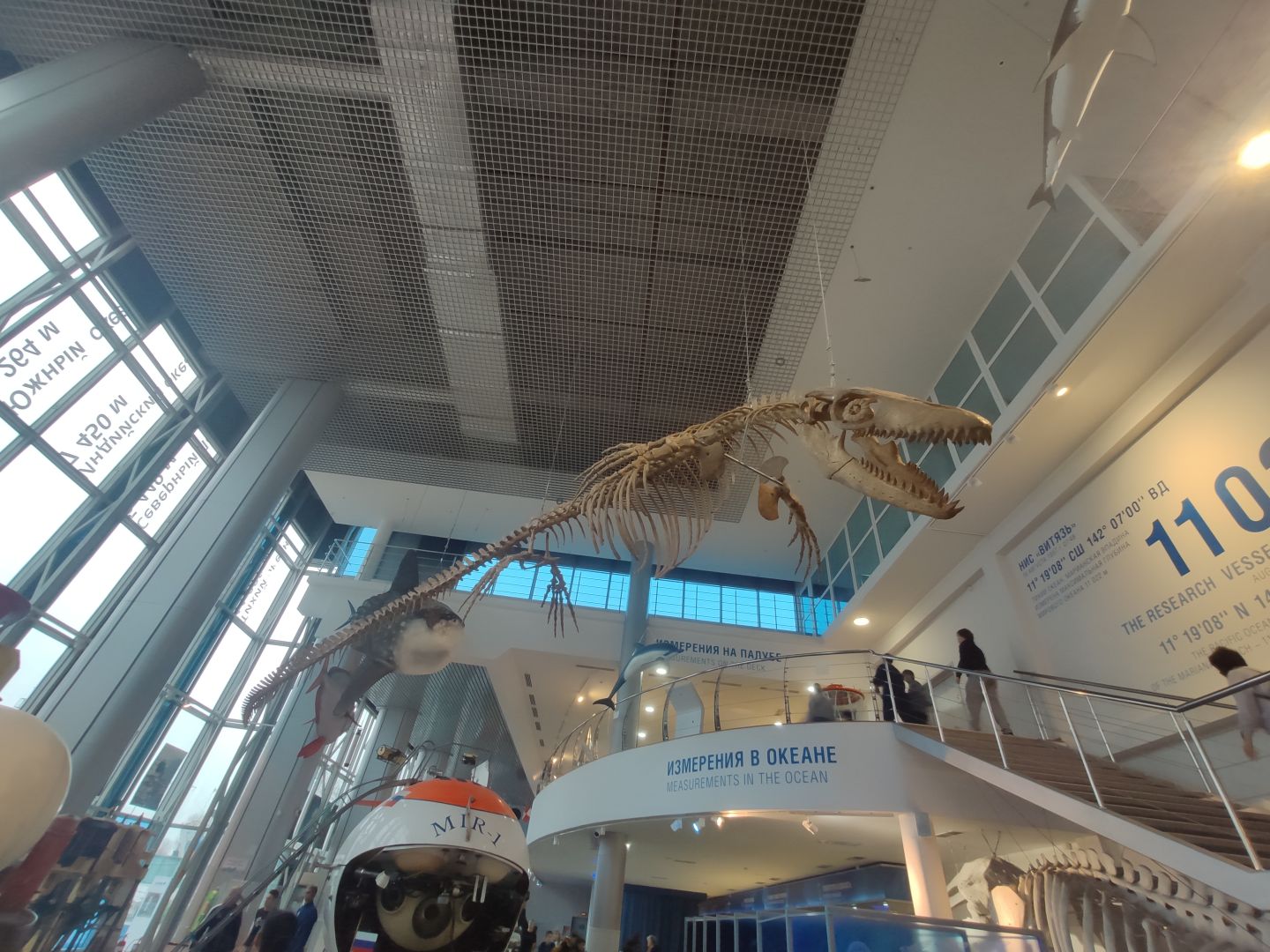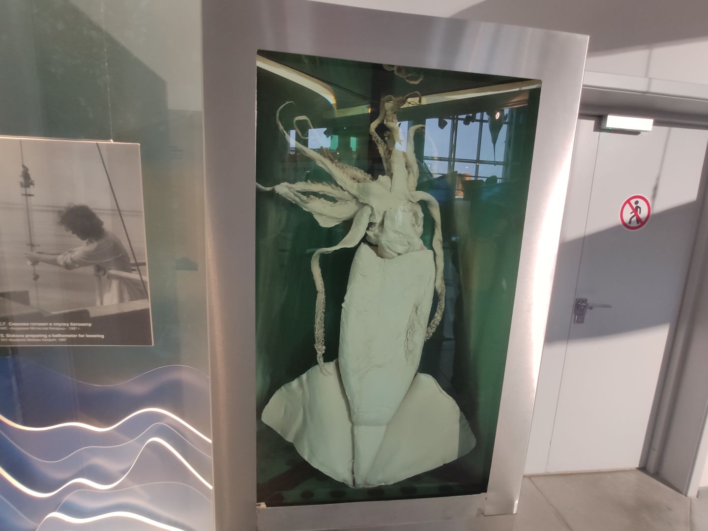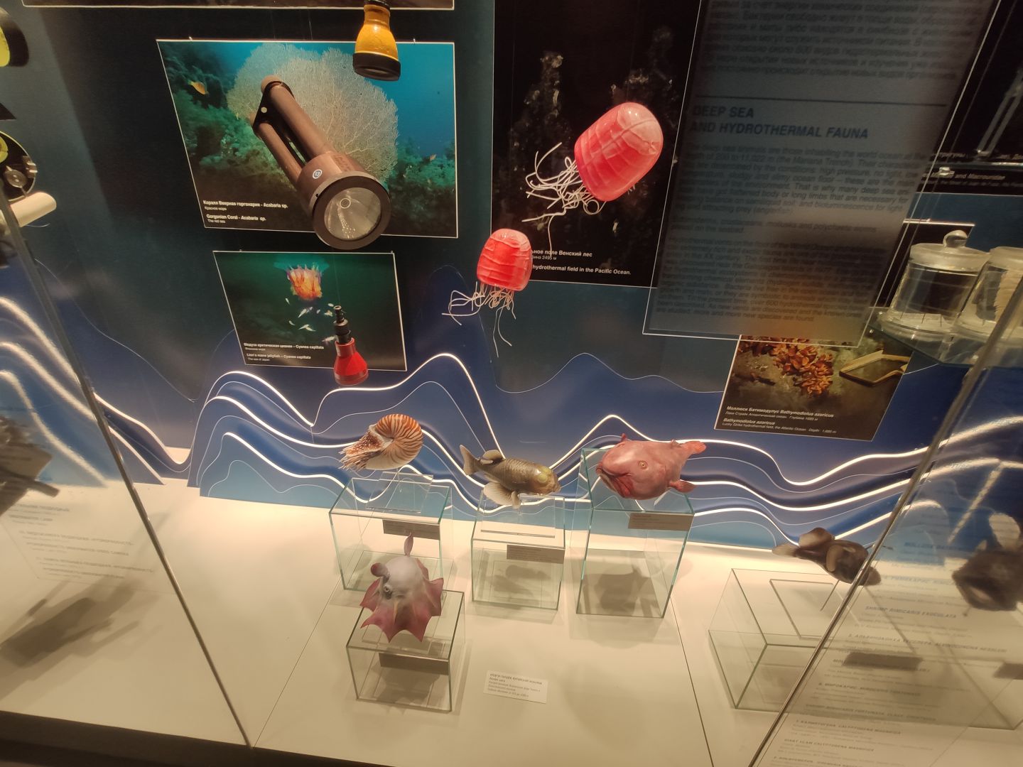 · Скелет кашалота. Этот 15-метровый гигант, парящий под потолком, — ключевая фигура. Кашалоты — одни из немногих млекопитающих, регулярно погружающихся на глубины свыше 2000 метров для охоты на гигантских кальмаров. Он символизирует связь поверхности и бездны.