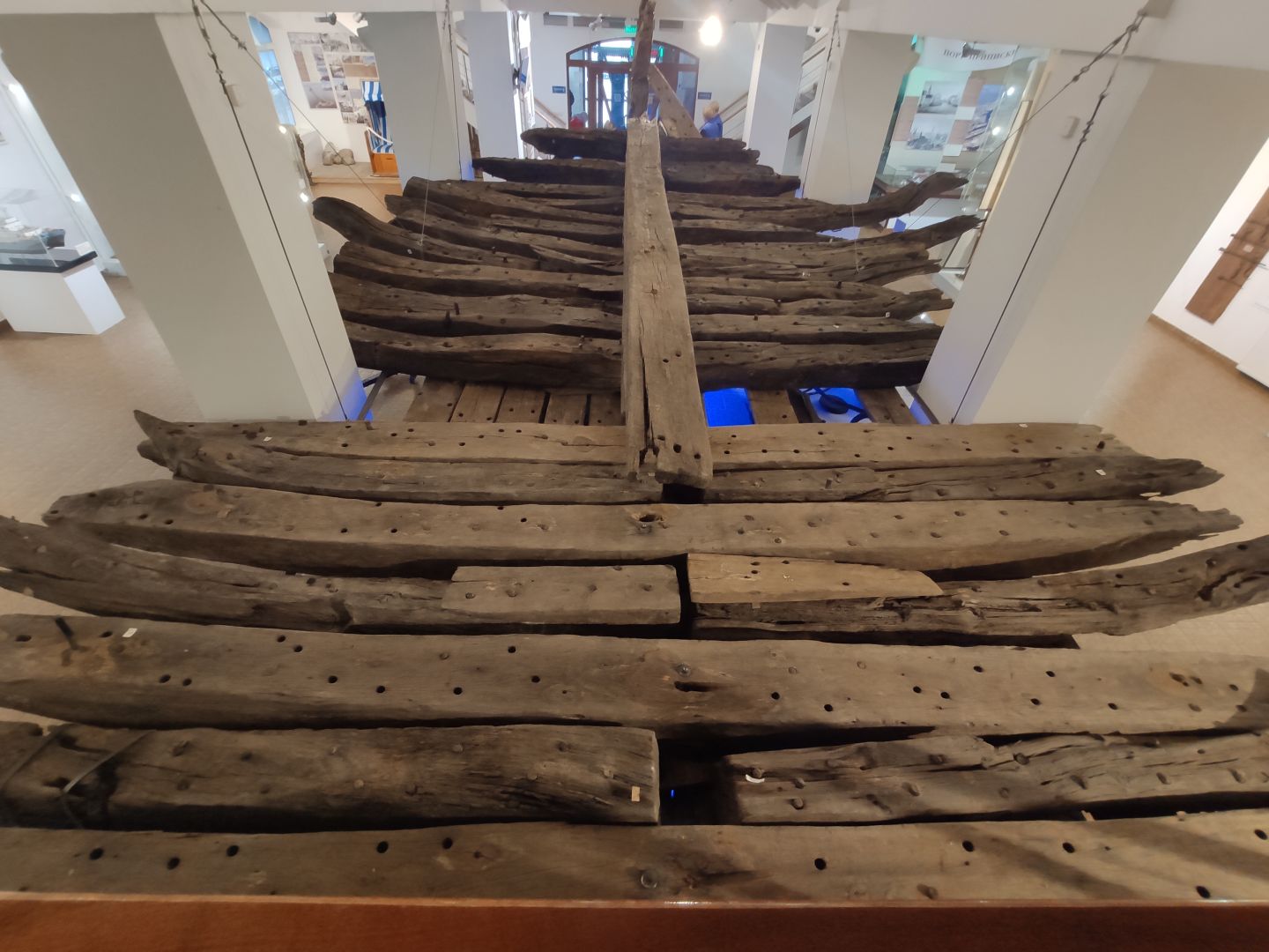 Прямо перед вами возвышается подлинный остов деревянного парусно-моторного бота. Это не макет. Это настоящий скелет судна, его киль, шпангоуты и стрингеры, освобожденные от обшивки. Дерево потемнело от времени и морской соли. Подойдя ближе, можно рассмотреть каждую деталь, каждое соединение. Этот каркас когда-то был основой для бортов, которые принимали на себя удары балтийских волн. Он — молчаливый символ судостроительного мастерства и тяжелого труда.