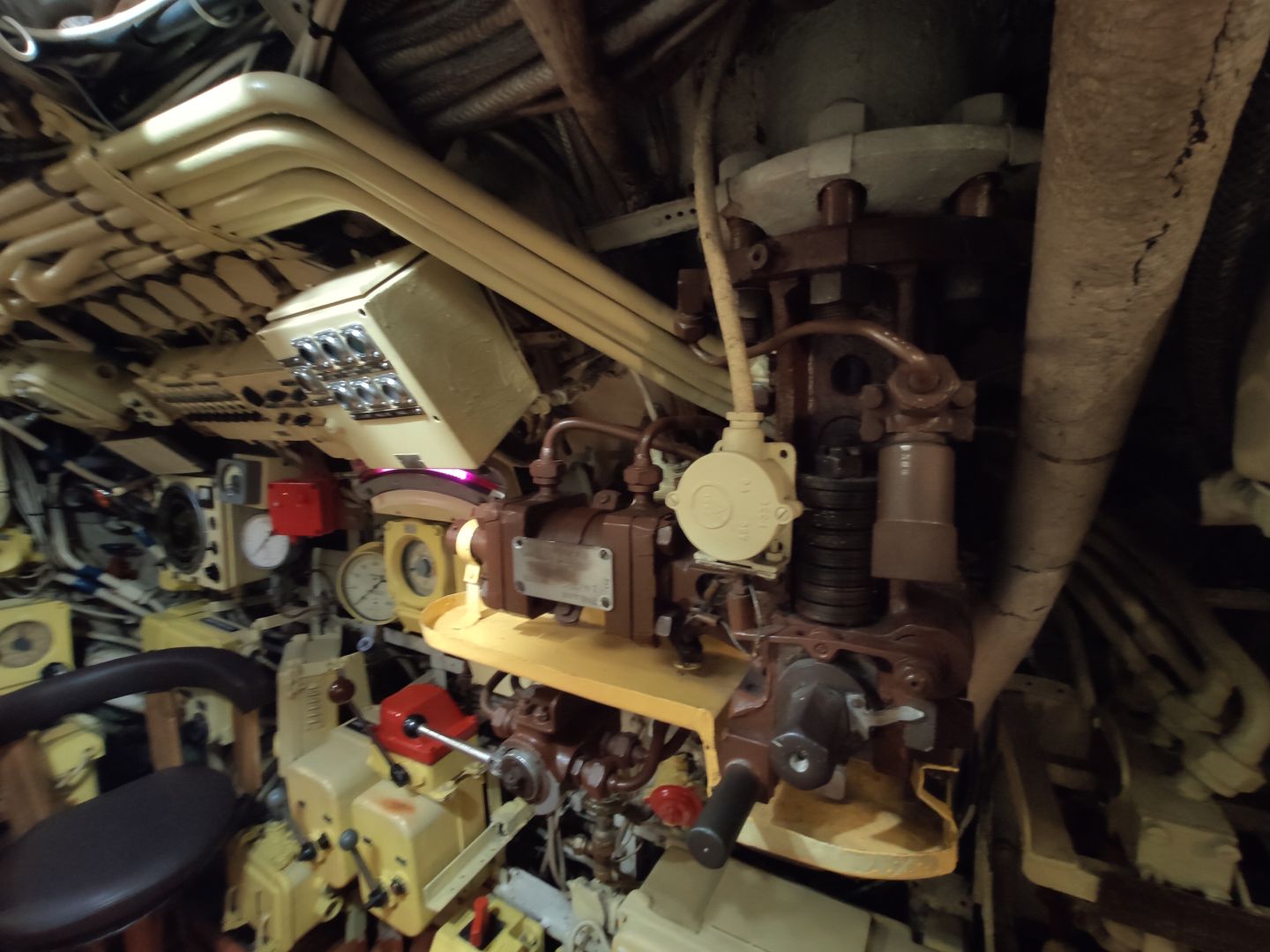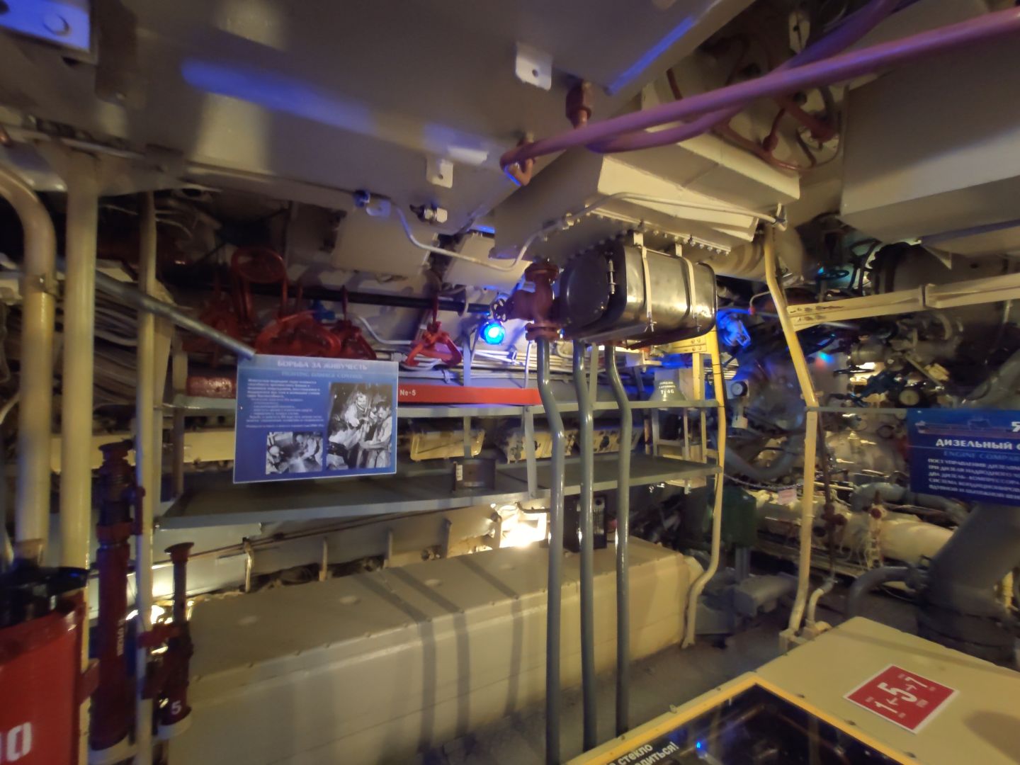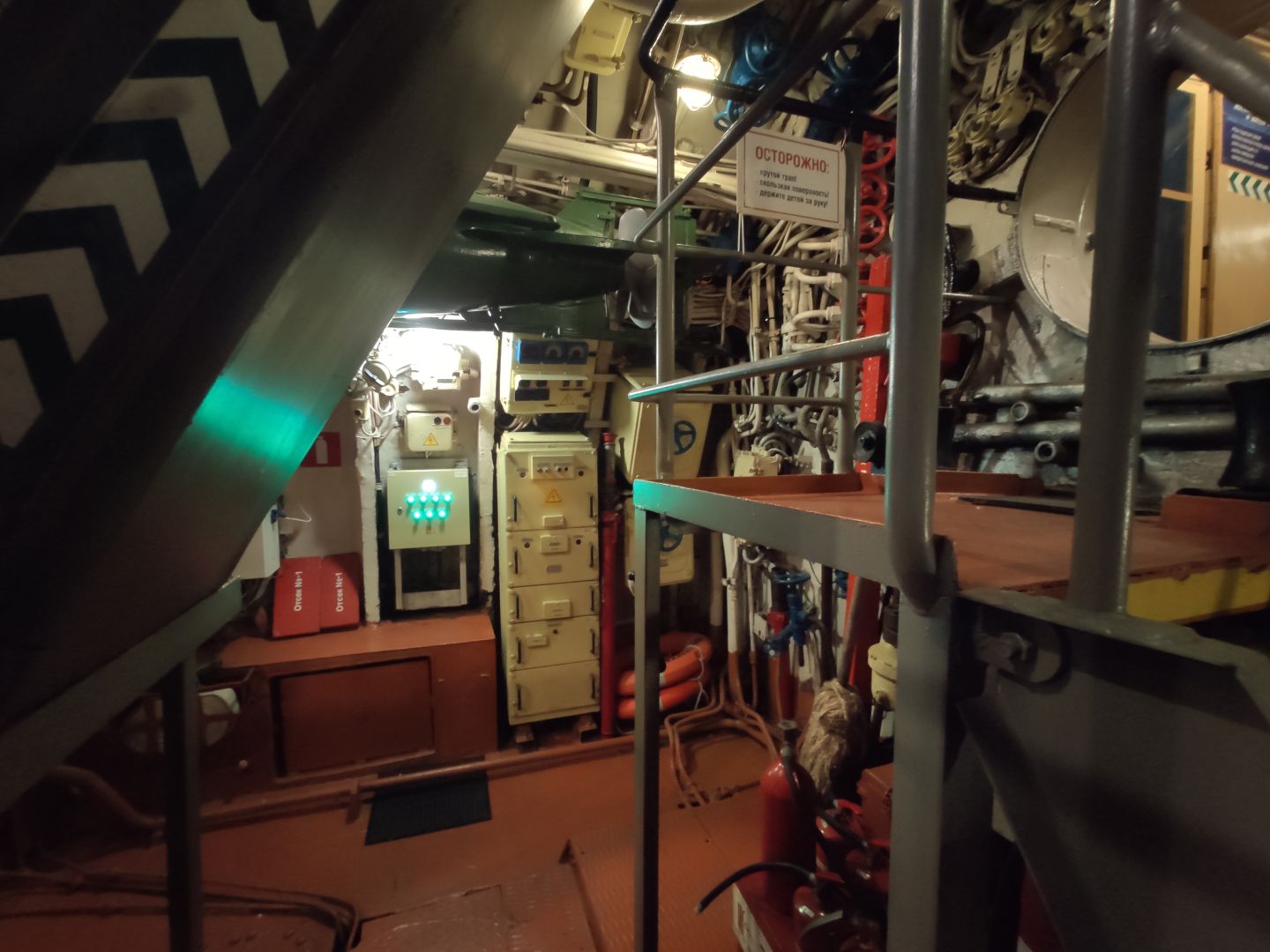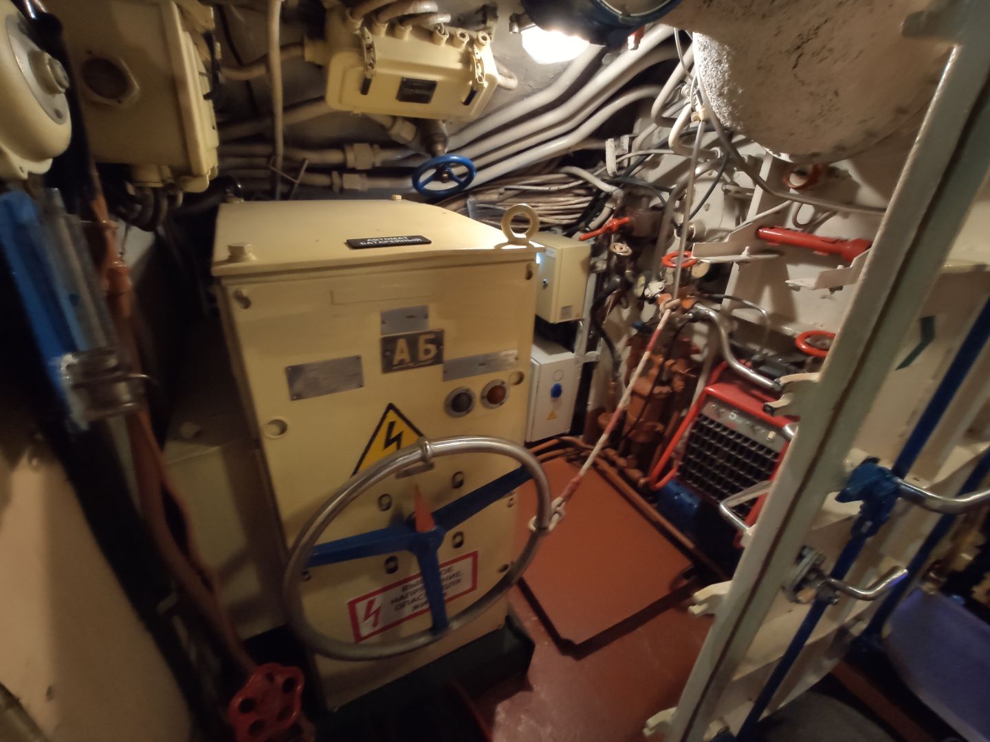 · Дизельный отсек: сердце, которое стучит. Спускаешься сюда — и попадаешь в царство механиков. Два огромных дизеля, которые давали лодке ход и заряжали аккумуляторы. Представьте этот гул в замкнутом пространстве! Рядом — гигантские электромоторы для бесшумного подводного хода. Высота позволяет стоять, но воздух наполнен памятью о машинном масле и напряженной работе.