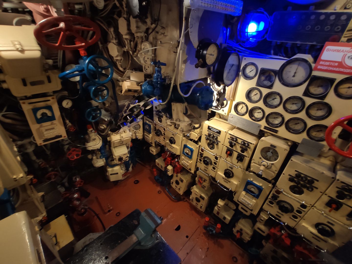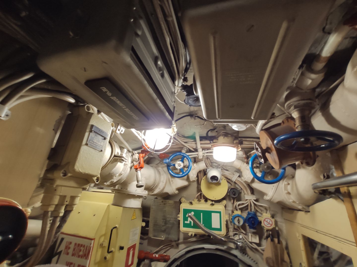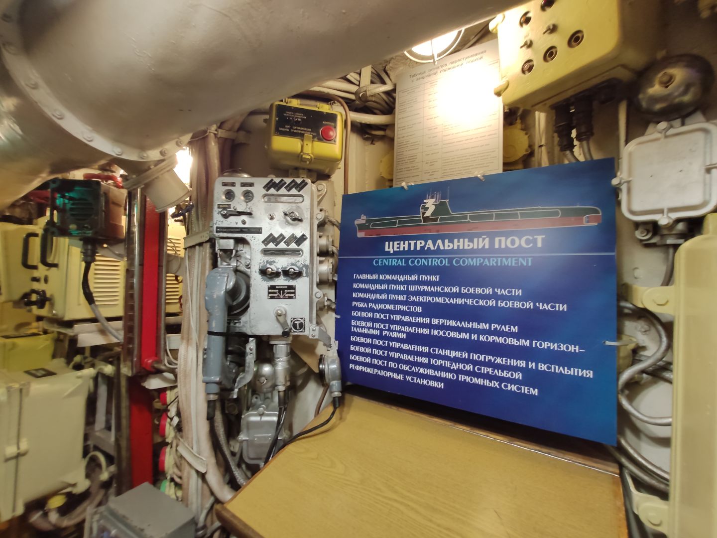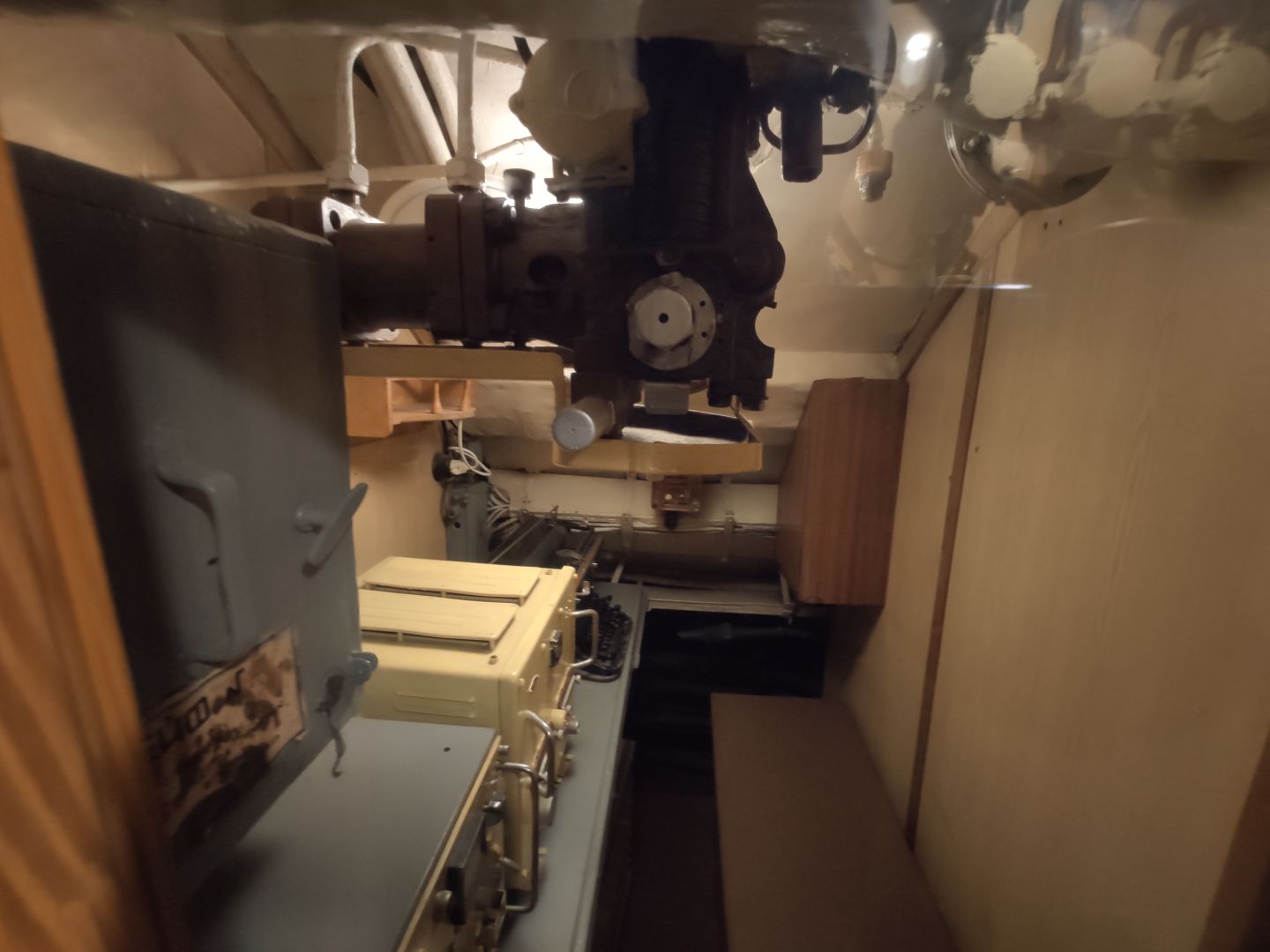 · Центральный пост: мозг субмарины. Это место — нервный узел всего корабля. Два перископа, как глаза лодки. Десятки вентилей, маховиков и кнопок. Штурвал горизонтальных рулей, с помощью которого лодка «ныряла». Здесь все настоящее, рабочее. Кажется, вот-вот прозвучит команда «Погружение!», и экипаж замернет у своих постов. И да, здесь тоже можно стоять прямо, но пространство заполнено оборудованием так, что чувствуешь себя частью сложного механизма.