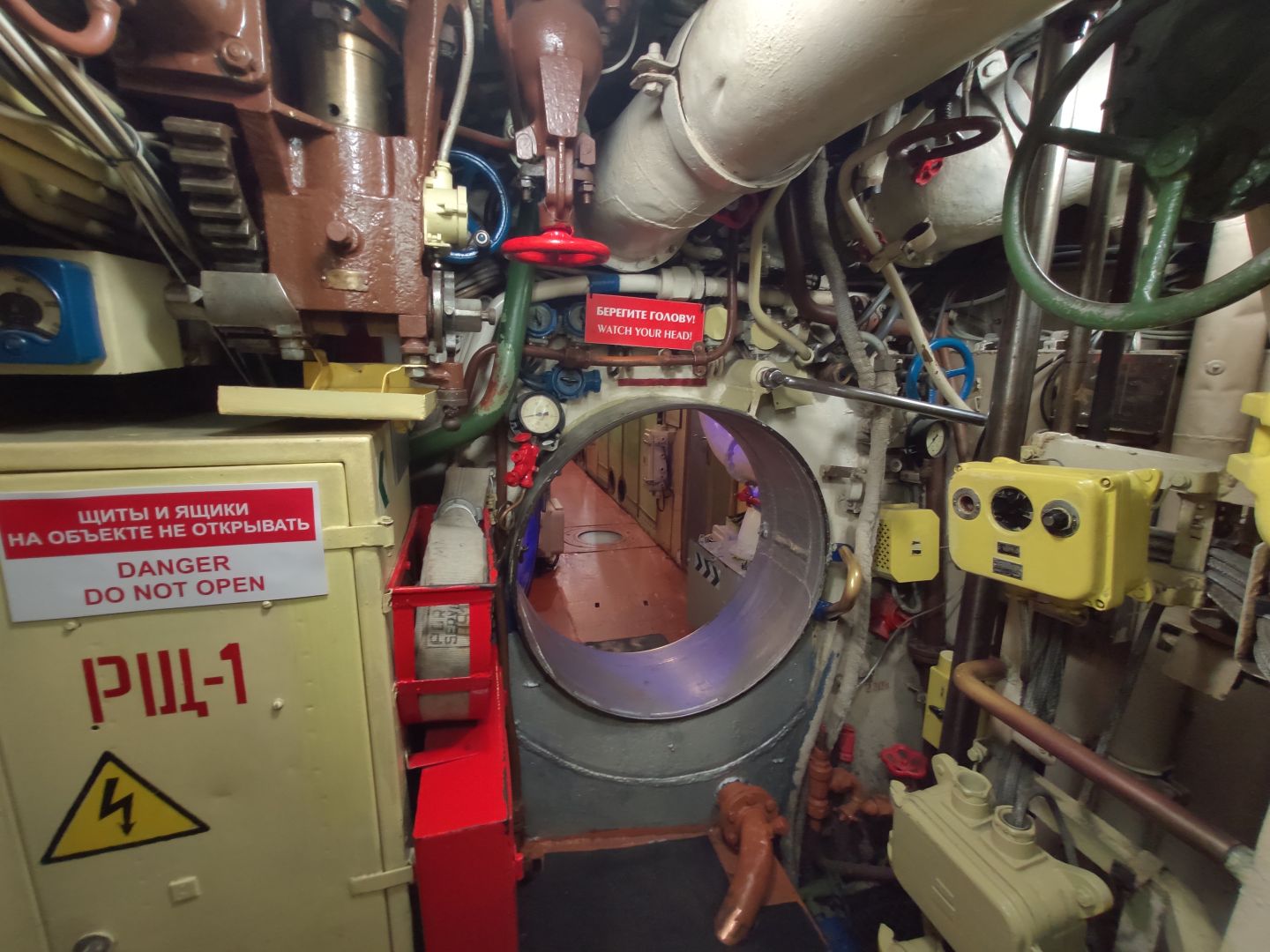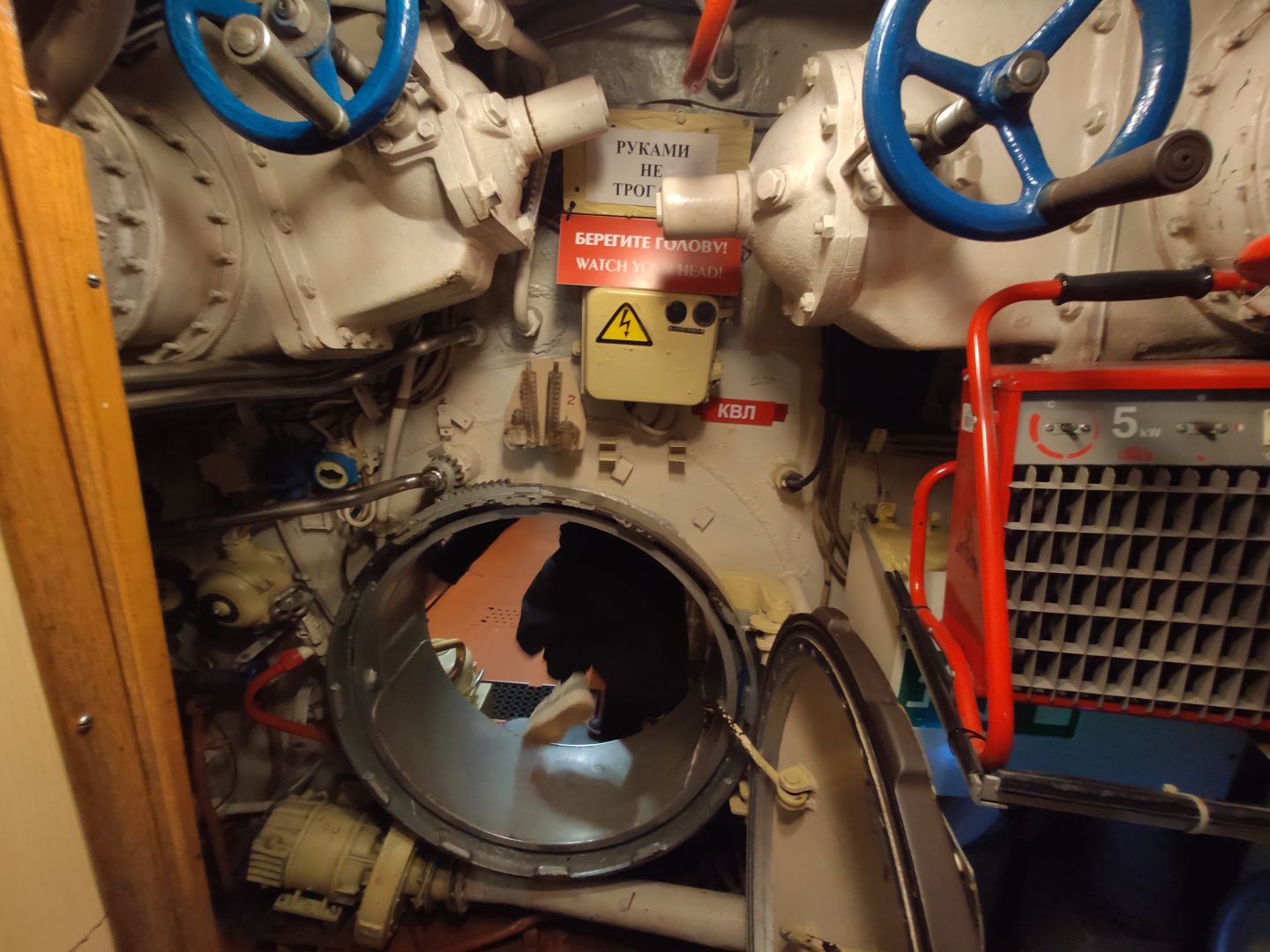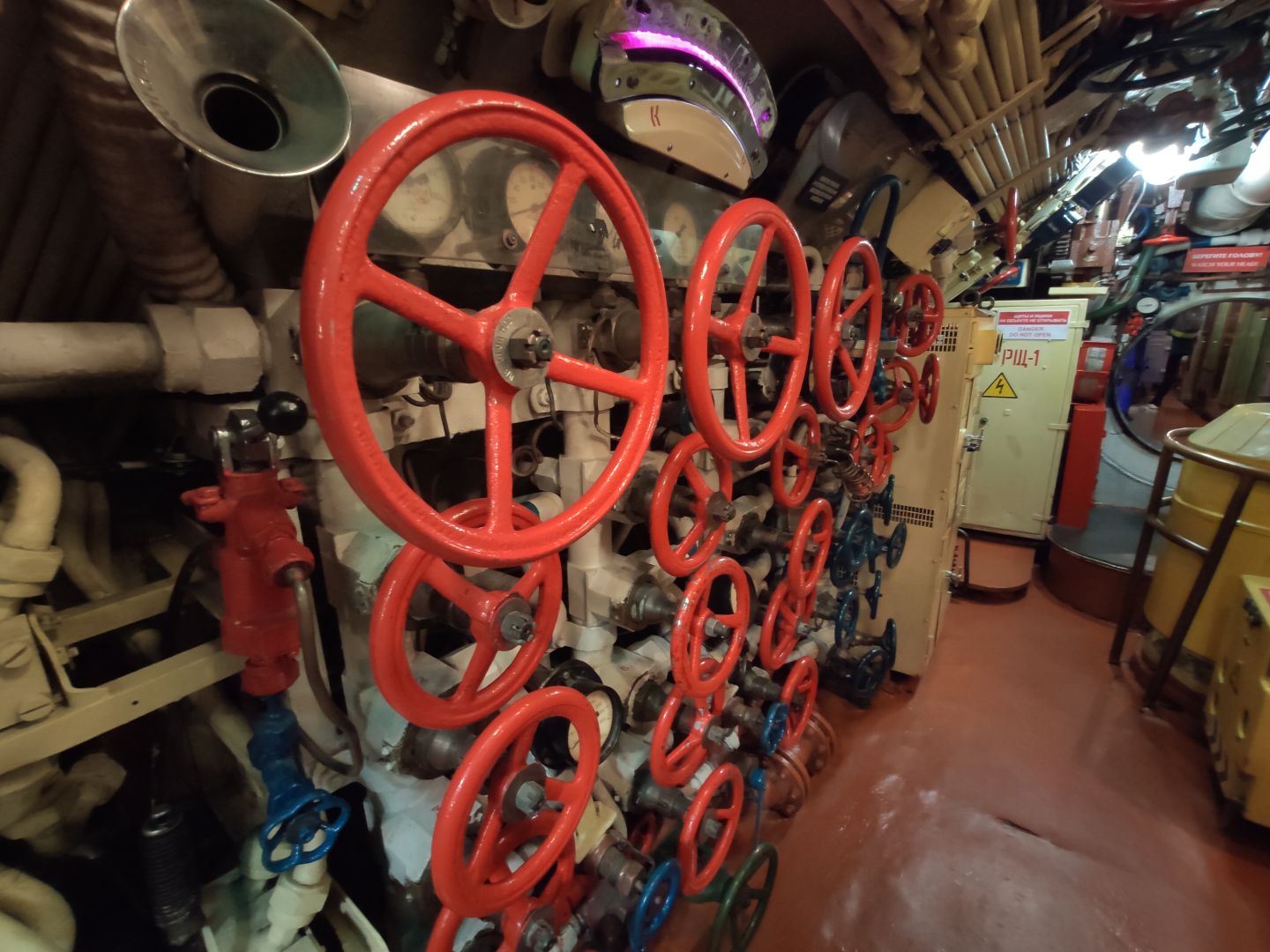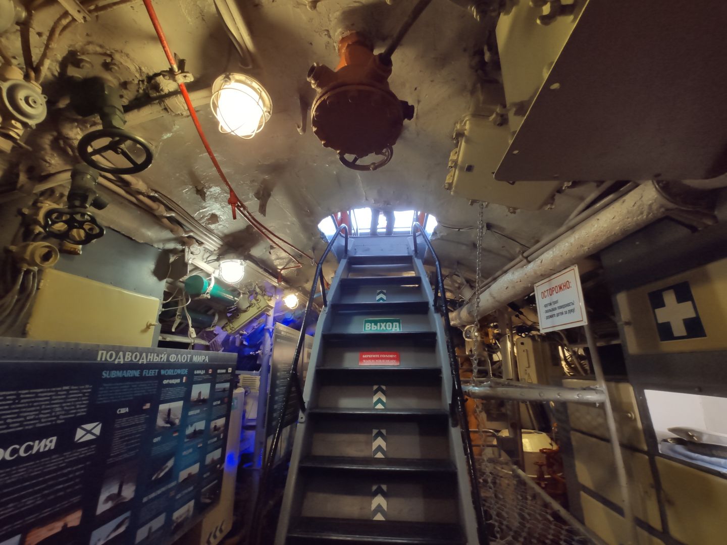 · Центральный пост: мозг субмарины. Это место — нервный узел всего корабля. Два перископа, как глаза лодки. Десятки вентилей, маховиков и кнопок. Штурвал горизонтальных рулей, с помощью которого лодка «ныряла». Здесь все настоящее, рабочее. Кажется, вот-вот прозвучит команда «Погружение!», и экипаж замернет у своих постов. И да, здесь тоже можно стоять прямо, но пространство заполнено оборудованием так, что чувствуешь себя частью сложного механизма.