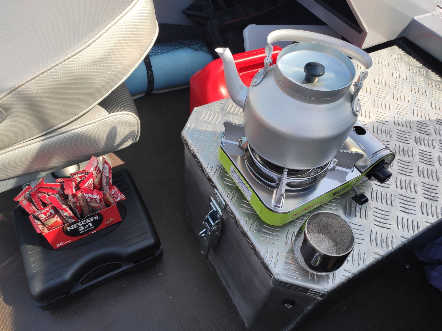 Потом встал вопрос с электрикой и отоплением. Штатный центральный рундук был маловат и неудобен. Заказал новый, большой, под свои размеры. Он теперь решает сразу три задачи: в его нутре живут мощный LiFePO4 аккумулятор на 36 вольт для носового электромотора, стационарное зарядное устройство для него и отдельный бак на семь литров под дизельный отопитель. Сверху — ровная крышка, отлично подходит в качестве стола, чтобы собрать снасть или перекусить. И по высоте он получился так, что теперь это удобная ступенька для прохода на носовую палубу.