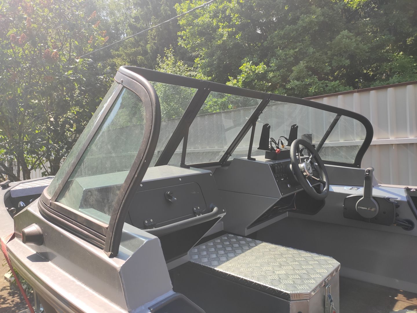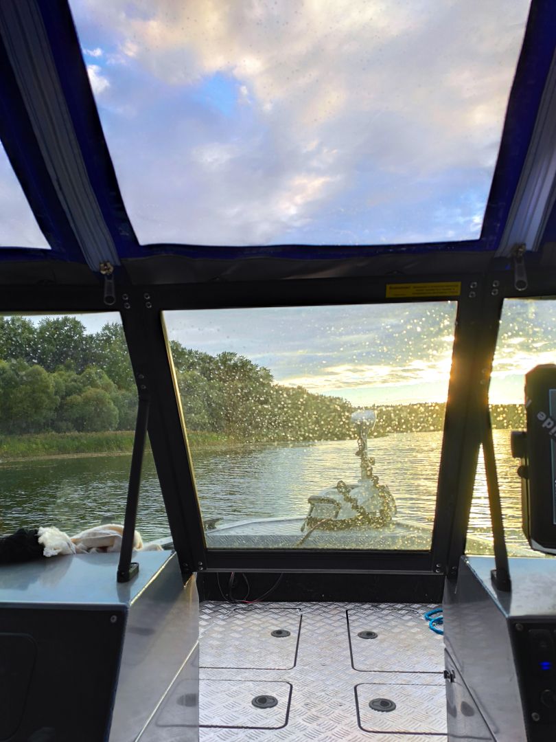 Первое, что поменял — родное стекло. Оно было мягкое, царапалось на раз. Поехал в Кострому, в «Лодку 44». Попросил сделать калёное, нормальное. Они сделали — теперь смотрю сквозь него, а не в сетку царапин. Штатного тента не было вообще, так что заказал сразу у них же. Не в полный рост, но чтобы голова и плечи были под защитой. Получилось аккуратно и по делу.